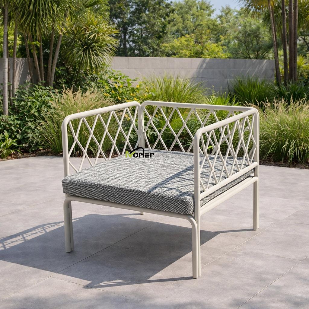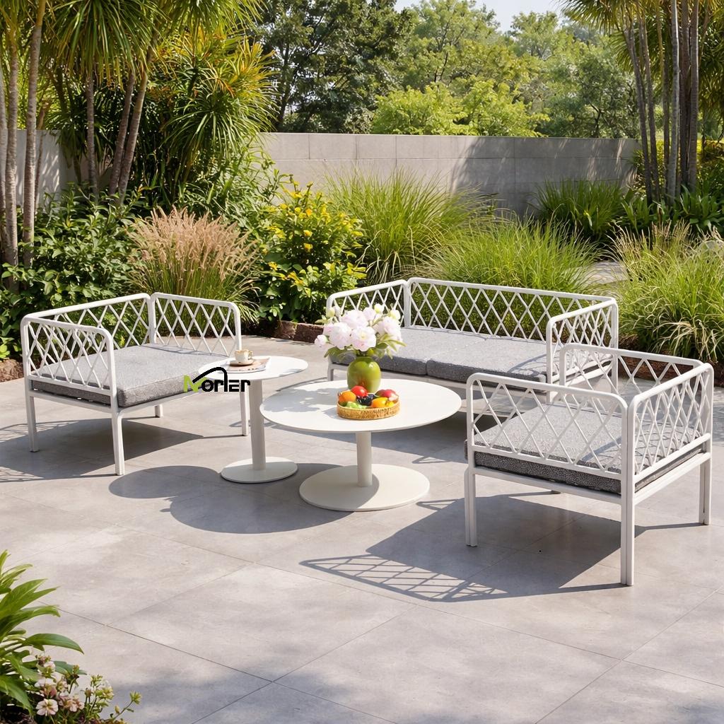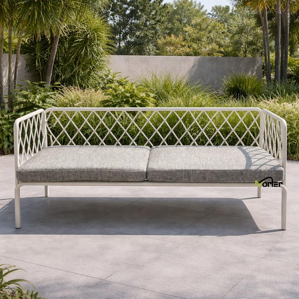 Set sofa luar ruangan modern ini menampilkan desain bersih dan minimal dengan bingkai logam geometris yang dibuat dengan indah. Struktur kisi terbuka menciptakan tampilan yang ringan dan elegan dengan tetap mempertahankan dukungan struktural yang kuat.